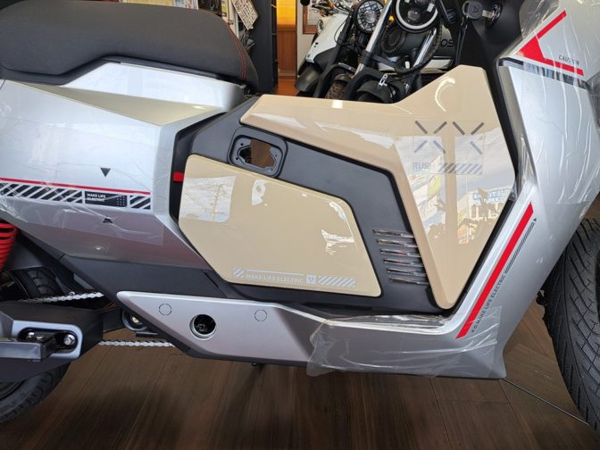 通常スクーターの魅力であるシート下収納は、燃料タンクに代わって大きなバッテリーが収まっているため、使えないのです。